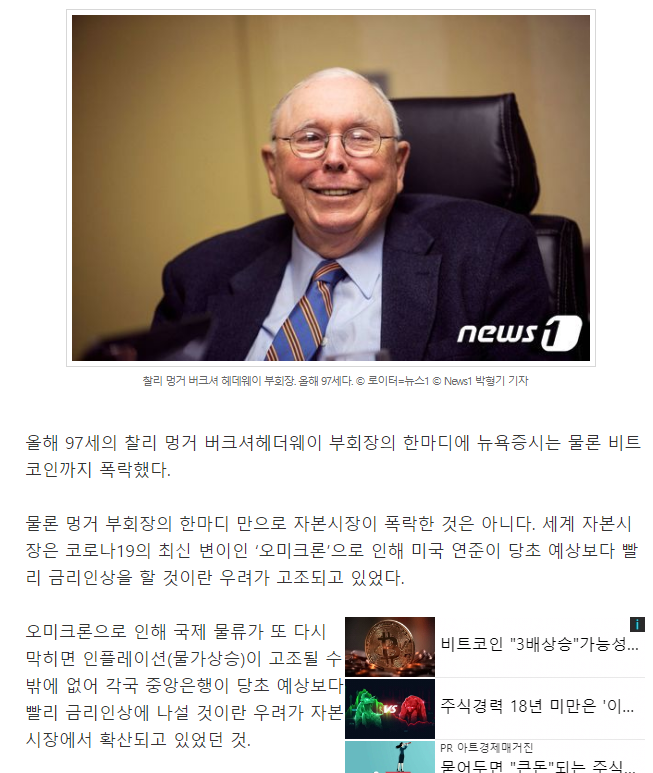 멍거 부회장은 지난 2일 그는 이날 시드니에서 열린 한 콘퍼런스에서 “최근 자본시장의 버블은 매우 심각하며, 1990년대 후반 닷컴버블 때보다 심하다. 시장이 미쳤다”고 말했다. 그는 특히 암호화폐(가상화폐)의 버블이 가장 심각하다고 지적했다. 그는 “암호화폐는 존재하지 말았어야 했다”며 중국의 규제 조치를 칭찬했다..